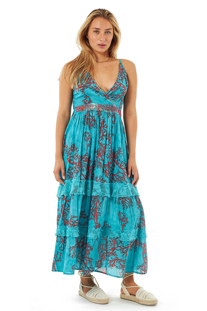 Turquoise Maxi Cotton Dress With A Coral Print