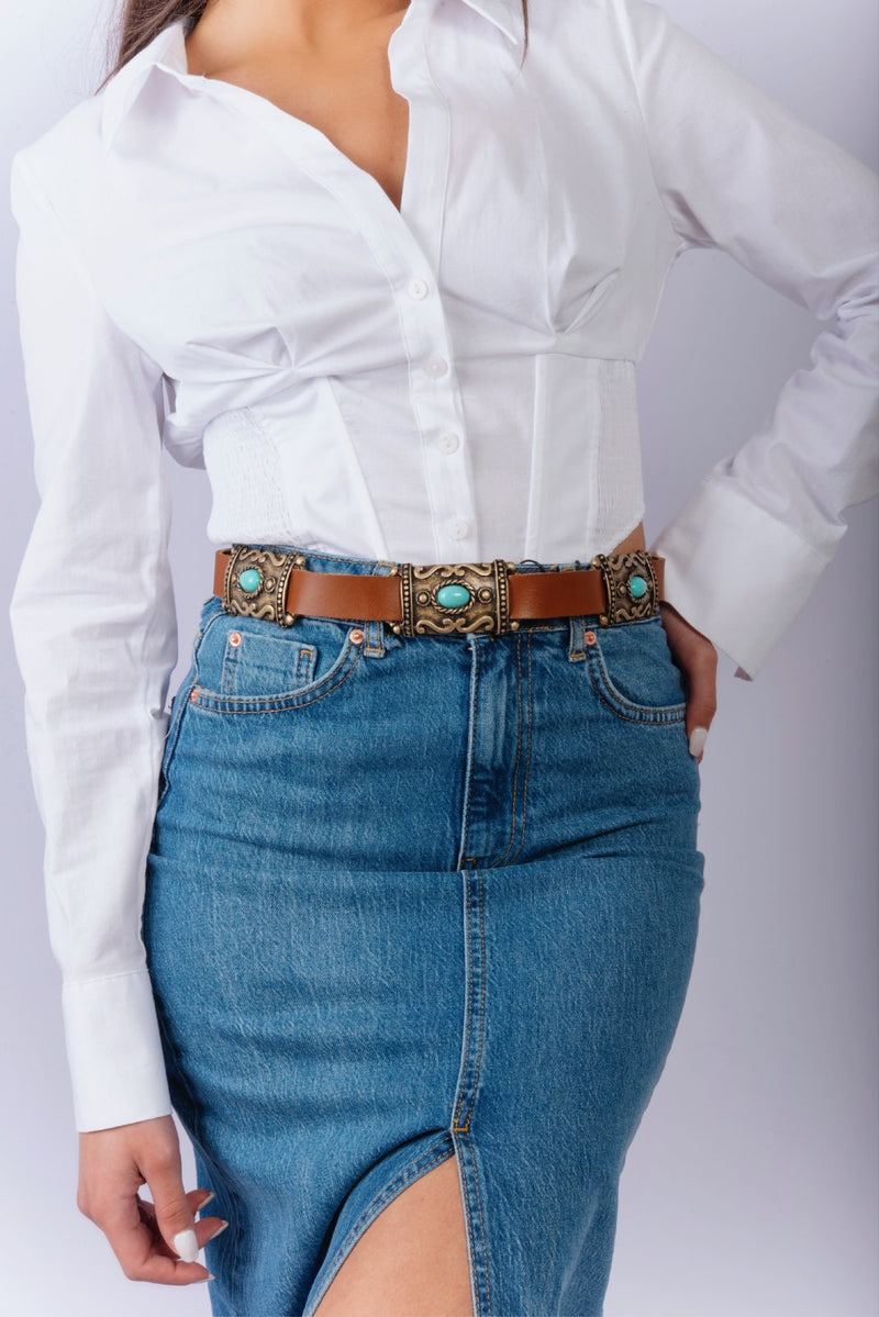 White Handmade Leather Belt With Bronze Decorations - Simona
