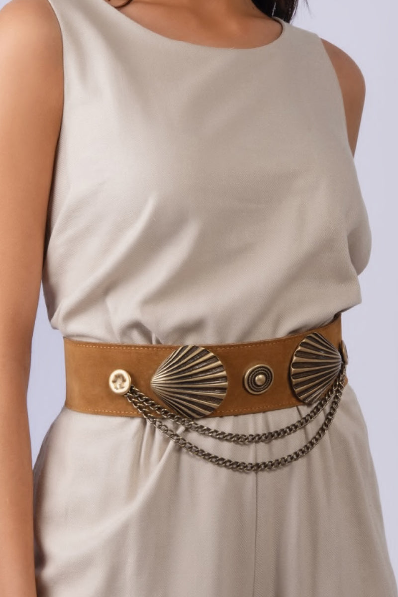 Camel Handmade Leather Belt With Bronze Decorations - Kithnia